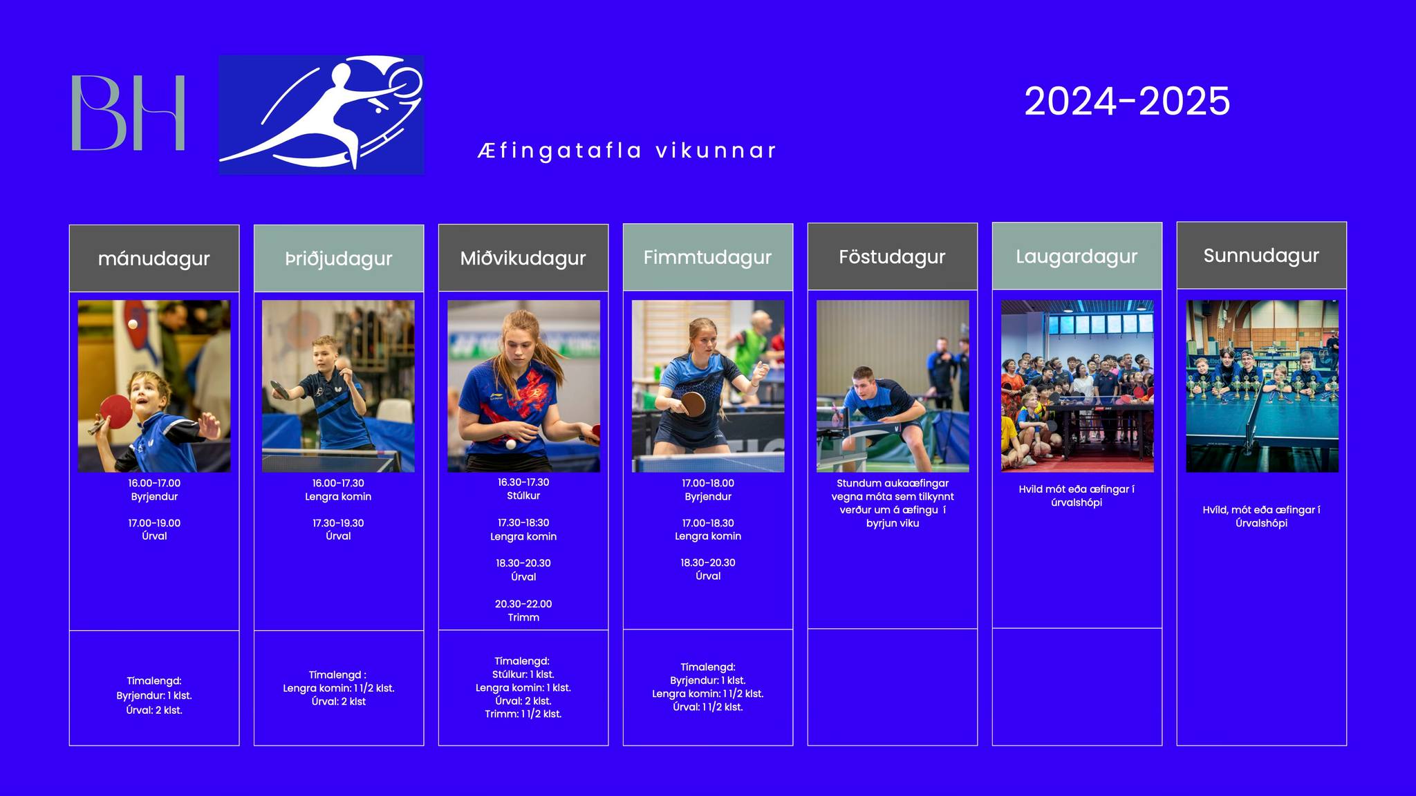 Allar nánari upplýsingar um starf Borðtennisdeildar BH veita Ingimar í síma 8618458 og Tómas í síma 6624196 eða í gegnum netfangið bhbordtennis@gmail.com.